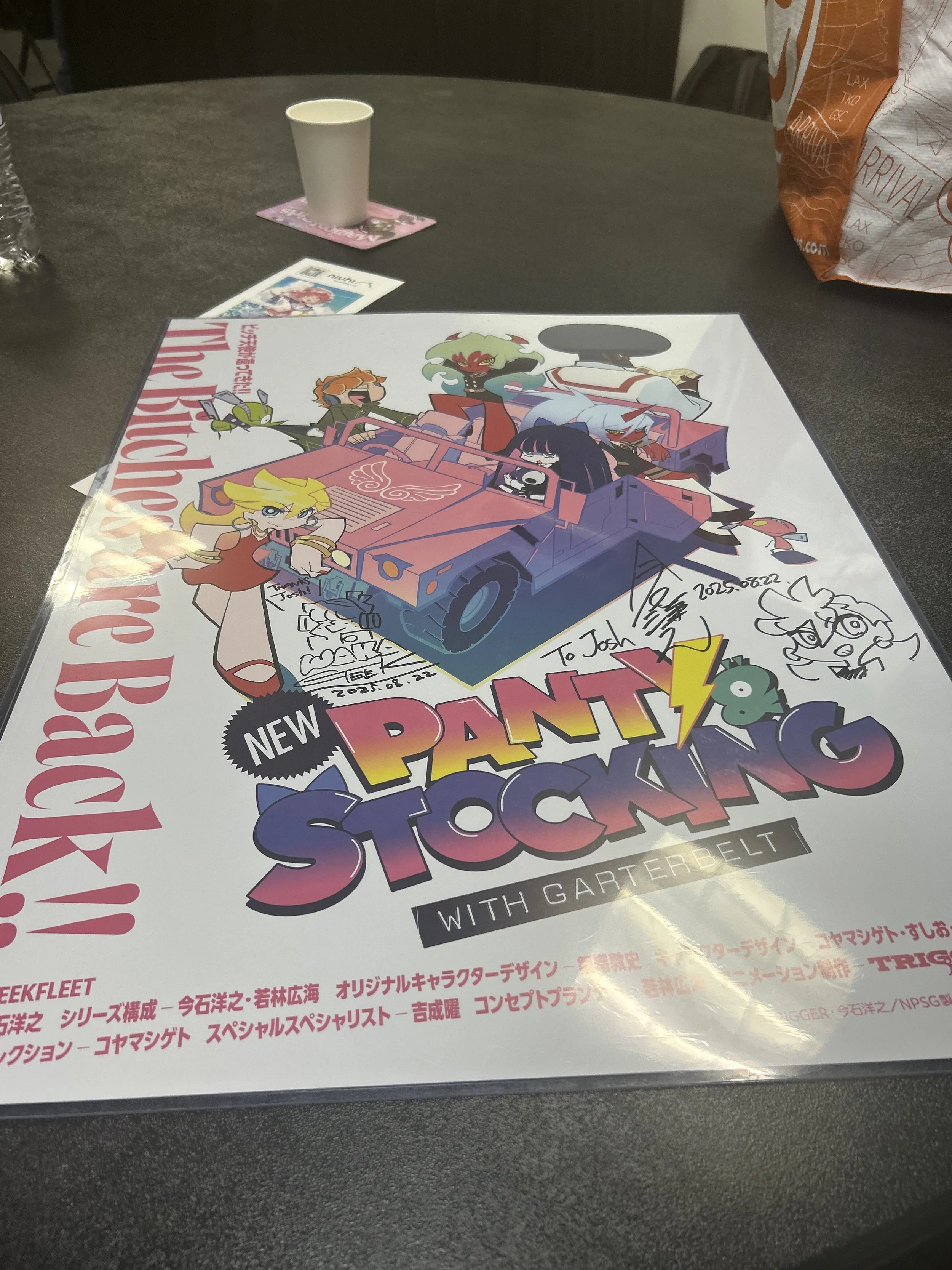 Lastly, I was able to attend a small, free signing event with Hiroyuki Imaishi and Hiromi Wakabayashi. All I could think to do was to thank them for all that they’d done over the years as Studio Trigger’s explosive action scenes and over-the-top comedy have influenced my writing for years. I’m also honored to say that I may have been one of the first people to give Imaishi and Wakabayashi a gift (One Massive Step) at one of these conventions, as the staff on call mentioned “they’d never received a gift before.”